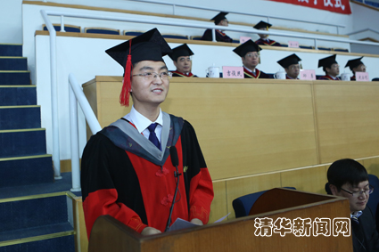 畢業生代表、物理系博士生張金松與大家分享了自己在清華十年學習科研生活的感悟。他以自己參與發現量子反;魻栃目蒲薪洑v為例,與大家分享了科研中面臨挑戰與困難時堅持不懈取得成就的心得體會。