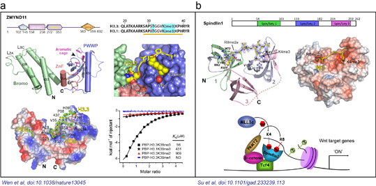 圖1. a) 組蛋白H3.3K36me3被ZMYND11串聯Bromo-ZnF-PWWP結構域識別;b)組蛋白H3“K4me3-R8me2a”被Spindlin1串聯Spin/Ssty結構域組合識別。