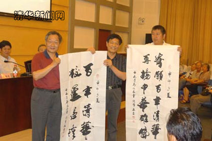 圖為岑章志接受繩順民學長為祝賀母校百年校慶撰寫的書法作品“百年清華,校運昌隆”。通訊員 解紅巖 攝