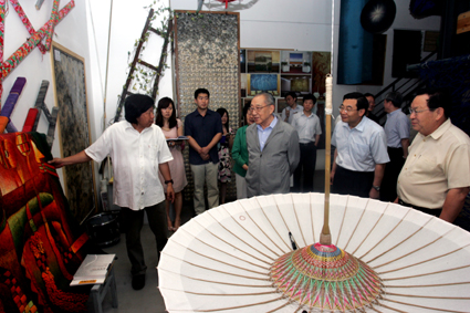 離開校史館,李嵐清來到美術學院參觀。在美院教師造型藝術作品展上,李嵐清饒有興致地觀賞著一幅幅美院教師的精美畫作,不時點頭稱贊。從版畫作品到傳統水墨山水圖,再到后現代藝術作品,他都流露出濃厚的興趣。在纖維藝術實驗室,李嵐清仔細聽取了林樂成教授對纖維藝術的介紹,這種將傳統手工技術與現代生活方式、審美方式相融合的藝術形式深深地吸引了他。當得知美院師生的纖維藝術作品在海外多國展出獲得很好反響時,李嵐清點頭稱贊,并欣然在一把傳統紙傘的傘面上寫下自己的名字。