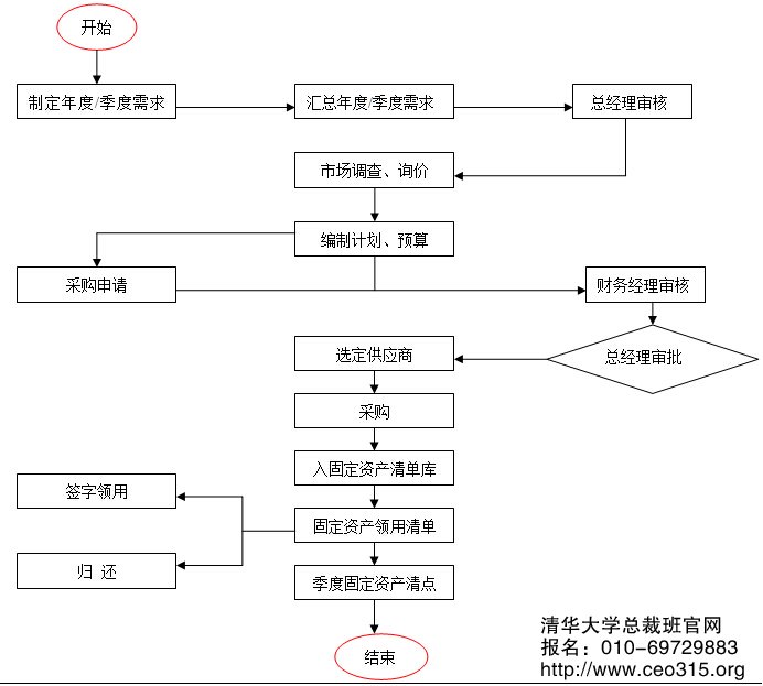 | 步驟 1 | 各部門于每季度第一個月的5日前編寫固定資產需求計劃,并提交綜合管理部門匯總;并上交總經理審核。 | 急采購不受此限制。申請部門、綜合部、總經理室 |