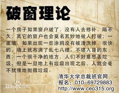 如果一棟房屋窗戶上的玻璃被一小孩人為地打破了一塊,而主人沒有及時補裝上玻璃的話,其他小孩可能會受到某些暗示和 " 鼓動 ",接著去打破更多的玻璃,到最終可能會造成整棟房屋的窗戶玻璃都被打破。這就是政治學家威爾遜和犯罪學家凱琳提出的 " 破窗效應 "。