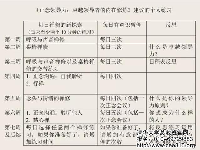 下面是一份正念領導力七周課程的練習安排表,大家可以參照練習。