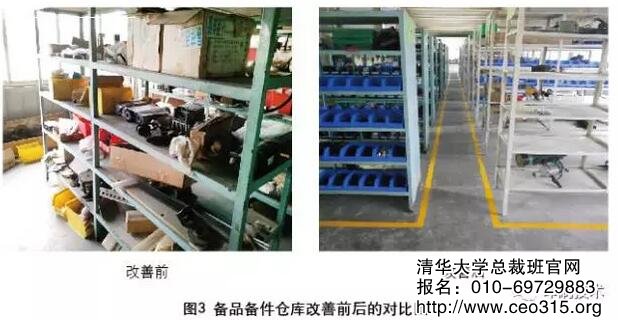 通過“洗澡運動”和“紅牌作戰”兩項活動,使得生產現場發生了明顯改觀,圖3為備品備件倉庫改善前后的對比圖?梢钥闯,兩項活動的開展塑造了清爽的工作場所,消除了過多的積壓物品,這不僅有助于穩定產品質量,還可以減少工業傷害。在6S現場管理專項工作進行過程中,各實施組對本區域進行劃分,明確各區域負責人,總結清掃方法,并針對各區域編制了《6S區域清掃基準書》。
