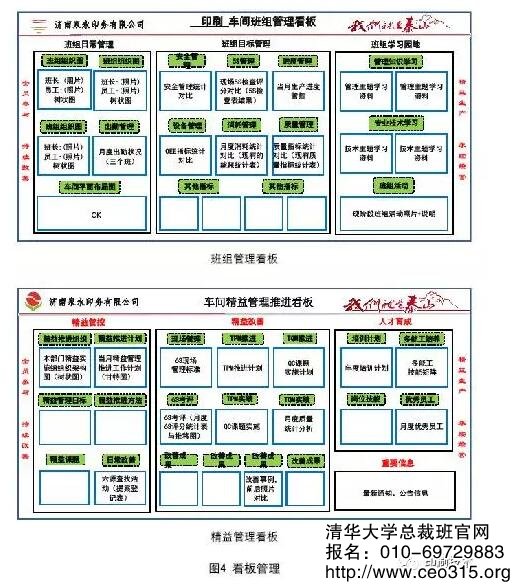 看板管理是一種以公開化和視覺顯示為特征的管理方式。利用視覺感知信息,組織現場生產活動,達到提高管理效率的目的。我公司根據產品主要工序和區域分類,將看板放置在不同車間,分別為印刷車間、燙模車間和印后車間。每個車間放置兩個看板,根據放置看板內容的不同,又分為班組管理看板和精益管理看板,如圖4所示。班組管理看板和精益管理看板分別涵蓋3大模塊內容。