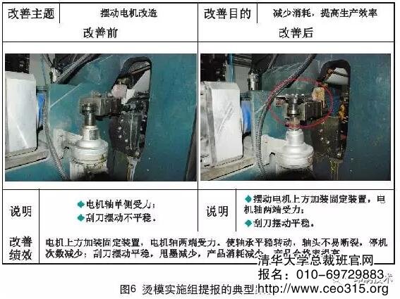 結合公司和各實施組的實際情況,我們分別設定了最佳組織獎、“六源”查找能手獎和“六源”查找特別獎3大獎項。圖6是燙模實施組提報的典型案例,通過對電機擺動裝置進行改造,改變了電機軸單端受力的情況,使得電機轉動平穩,受力均勻,延長了使用壽命,同時減少了產品消耗,提高了產品質量,我們在公司內部進行了有效推廣。基于上述情況,在階段性總結中對其提報人進行獎勵,該案例作為典型案例在看板中進行宣傳。