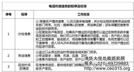 進行固化信息傳遞點的工作規范設計。由于客響中心人員在與客戶或相關配合崗位溝通過程中,會遇到各種各樣的不同問題,如何在各種信息傳遞過程中實現用語的更為專業化和職業化,是體現客響中心人員價值的關鍵所在。華恒智信通過信息傳遞的不同方式(如電話、郵件、短信息平臺等)角度,分別設計了相應的傳遞信息的程序與標準,將信息傳遞過程中的關鍵點加以固化,如:電話傳遞信息的程序與標準中,首先確定分撿信息、傳遞信息、回復時間的確定這幾個程序,進而再確定各個程序中的工作標準(詳見下圖)。同時,將電話溝通中的用語加以規范,針對經常會遇到的各種問題,提出規范的回答。如:遇到客戶詢問“什么時候可以背箱,在網上看不到信息?”的問題時,其規范的回答就是:“請問提單號是?稍等(客響聯系操作),您好,操作已經與碼頭聯系好了,隨時可以背箱,網絡系統有問題所以沒顯示”。