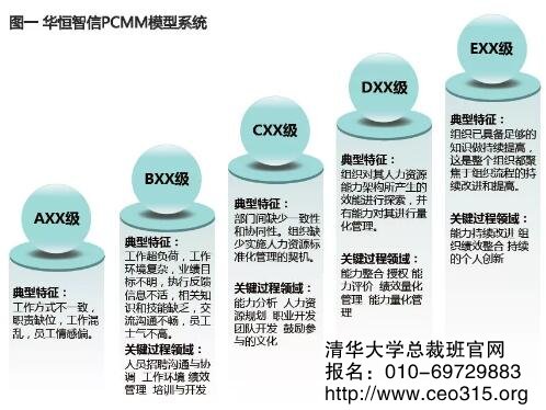 華恒智信PCMM模型系統由AXX級、BXX級、CXX級、DXX級和EXX級5 個成熟度等級或進化階段組成。不同的等級具有不同的特征以及關鍵過程領域,具體如圖一。