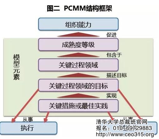 華恒智信PCMM模型系統的結構框架由成熟度等級(Maturity Levels)、關鍵過程領域(Key Process Areas)、 目標(Goals)、關鍵實踐(Key Practices)等元素組成。成熟度等級說明了人力資源能力所處的成熟度級別,以及這一級別所應該達到的標準。關鍵過程領域是人力資源能力成熟度模型的一個重要組成部分,它標示出企業在既定的能力等級下,人力資源管理的關鍵過程領域。關鍵過程領域的目標是為使關鍵過程領域達到相應的程度與狀態所需要達到的具體目標。關鍵措施或是最佳實踐是某一關鍵過程領域中的具體管理措施的指南與標桿,是達到關鍵過程領域目標的參考。(如圖二)