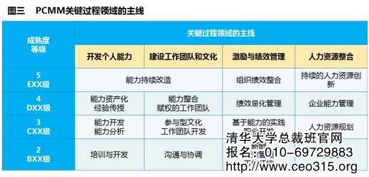 PCMM的成熟度等級與關鍵過程領域22個關鍵過程領域從橫向來說(如圖三),與等級的特征緊密相聯系;從縱向來說,圍繞四條主線來展開:開發個人能力、建設工作團隊和文化、激勵與績效管理、人力資源整合。而這四條也是本案中的電力公司自身業務已日漸成熟后,人力資源管理也由過去業務擴張階段的人力供給轉向人力建設。即如何圍繞縱向四條來展開工作。