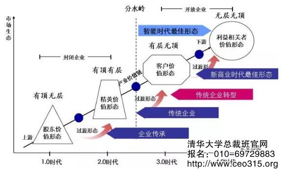 股東價值形態在改革開放初期大量出現,今天依然存在但數量越來越少;精英價值形態上世紀90年代后開始出現,成為了今天人們常說的傳統企業;利益相關者價值形態是工業4.0時代的產物,尚未到來;而客戶價值形態則是新商業時代的最佳企業形態,也稱之為新組織,西方一些先進企業已經進化到這個階段。從精英價值形態邁向客戶價值形態,是企業進化過程中的分水嶺,這是一次質的飛躍,中國企業轉型恰恰處于這個階段。