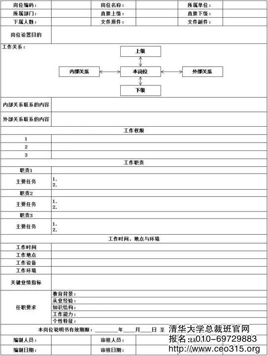 崗位說明書的格式因公司發展階段不同、需求不同、崗位分析的目的不同等因素不盡相同,可繁可簡。編寫崗位說明書之前,需要做如下考慮。