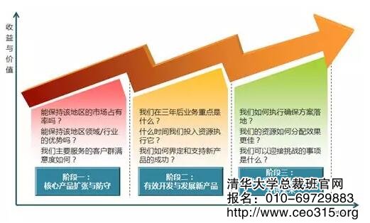 管理學上有一句名言:“1個管理決策的錯誤,500個執行也彌補不了。”可見戰略定位決策在企業管理上舉足輕重的作用。戰略的選擇可以讓企業能夠更加明確自己的客戶是誰,哪些事情能做,哪些事情不可以做,因此戰略管理的核心也可說是“防止南轅北轍”的事情在企業發生。我們在做選擇題,評估什么樣的選擇對我們長期有益,什么選擇對現實收益有益,然后決定我們怎樣做,因為目標的準確清晰才是企業快速獲得增值和提升的根本原因。經過多年的實踐經驗,華恒智信專家建議從三個階段來評判和定位公司的發展戰略,各階段都要有不同的發展目標。如下圖: