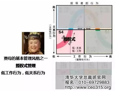 所以,該理論用這兩個維度把管理風格分為四類,有兩種是賈母的基本管理風格,第一種就是其中位于左下角的授權型領導風格:
