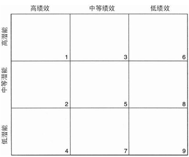 這是一個快速審視領導層級的有效工具。例如,公司可能發現其職能經理都集中在中等潛能-中等繢效方格內,