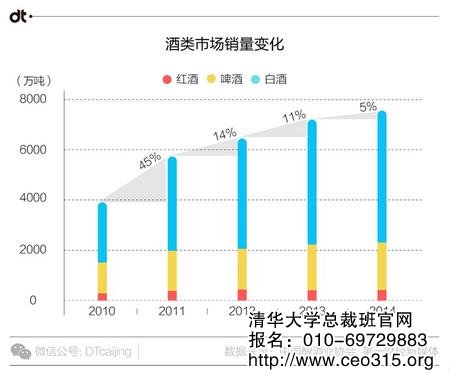白酒的市場銷量增速從2010年的54.7%迅速跌落至2014年的4.8%。受此波及,2013年和2014年,白酒產量的年增長率也從過去的兩位數驟降至6%和2%,可以看到白酒的線下市場銷量由高速轉入低速增長模式。