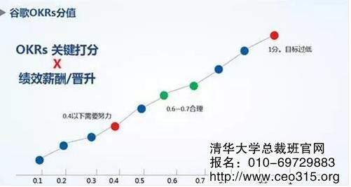 一般來說,1為總分的評分,達到0.6~0.7是比較合理的。如果0.4以下,說明你不及格還需要努力。如果你的目標得了一分,也就是你的目標是百分之百完成的話,谷歌反而會認為你的目標定的太容易、太低了,經理會里質疑你。谷歌OKRs分值示意圖如下: