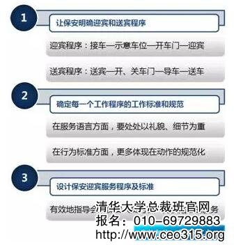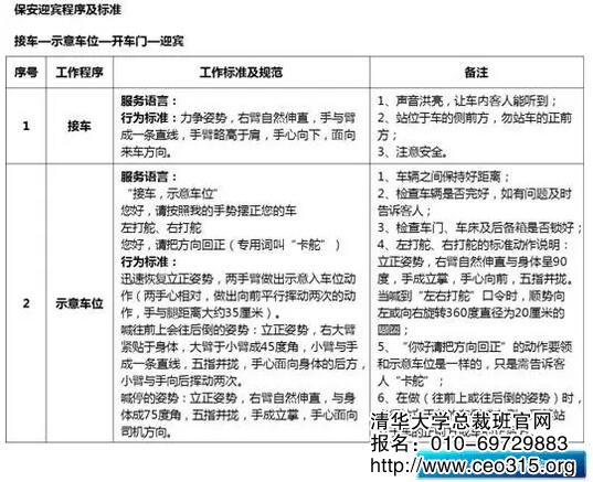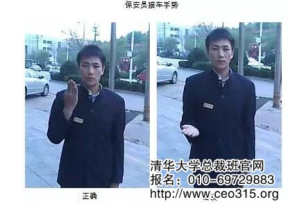首先,要對保安人員的迎賓和送賓程序予以確定,讓保安人員明確其每項工作的具體程序是怎樣的。如:迎賓時的程序是:接車——示意車位——開車門——迎賓。送賓時的程序為:送賓——開、關車門——導車——送車。