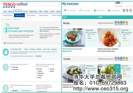 【案例】英國食品超市Tesco在其網站推出Meal Planner功能,比如對一個4口之家,只需輸入烹飪計劃的具體要求:7天或5天,一日三餐還是兩餐,特殊口味(素食),烹飪制作時間(30分鐘,60分鐘等),就會得到Tesco專家系統推薦的每日烹飪食譜及食材清單。這個周一的泰國魚餅及黃瓜蘸汁看起來很清新可口吧!