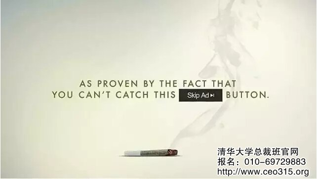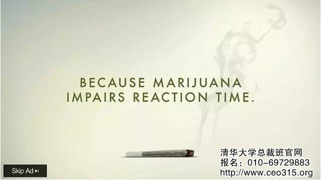 整個廣告就是借助大家熟悉的跳過按鈕來說明,如果你吸食大麻,反應就會變慢,行動會很遲緩,你開車的時候就不能很好地掌控方向盤,就像現在你不能準確點擊跳過按鈕一樣。