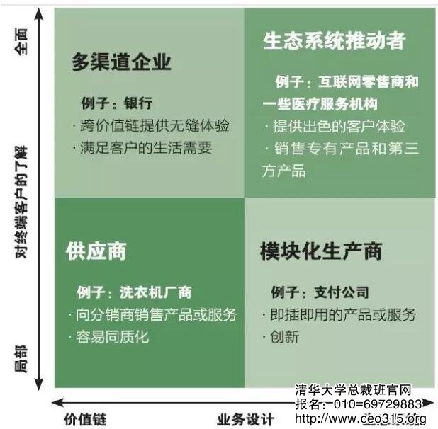 模塊化生產商位于右下象限,它們提供了一種涵蓋整個生態系統的獨特能力,但是它們對終端客戶缺乏直接了解。它們即插即用的產品或服務適用于眾多的渠道或合作伙伴,但是它們依賴別人來分銷并且了解客戶需要什么。這方面的一個典例就是讓消費者能夠付費購買眾多產品和服務(比如日用百貨和大學學費)的支付公司。