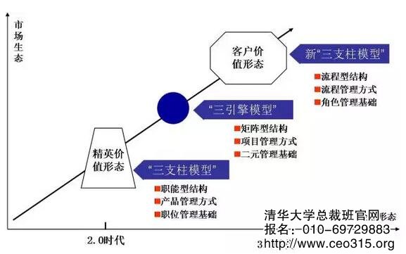 截取精英價值形態邁向客戶價值形態這段進化歷程,就有三種不同的管理模式。其中職能型結構、職位管理基礎、產品管理機制就是傳統管理模式特點,稱之為傳統企業“三支柱模型”,幾乎在所有傳統企業中都能找到“三支柱模型”的身影,這也是判斷是否傳統企業的標準。未來的新組織將具有客戶價值形態的特征,其管理模式特征也有“三支柱模型”,但此“三支柱模型”非彼“三支柱模型”:流程型組織結構、能力管理基礎與流程管理方式,在西方一些先進企業中都能找到新“三支柱模型”的身影。轉型企業則兼有前后兩種管理模式的特點,我稱之為“三引擎模型”:矩陣型組織結構、項目管理方式與二元管理基礎(職位管理與角色管理),所謂“引擎”是指動力來源,由于傳統企業很難一步到位,只能通過“三引擎”實現有序轉變,在中國但凡擺脫“傳統”標簽的企業都有“三引擎模型”的身影。