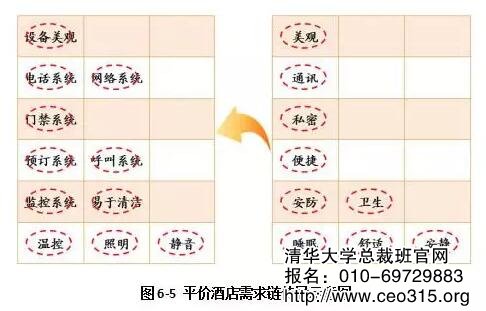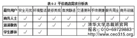 在全面調研基礎上,詳盡羅列出最終用戶群對賓館的具體要求,譬如中低端商務人士的要求是交通、通訊便利,安全無憂,環境整潔,客房靜謐、手續便捷,裝修雖不豪華但要美觀,設施雖不奢華但要舒適,商務設施齊備……將最終用戶的各種要求歸納整理,可得表6-2。