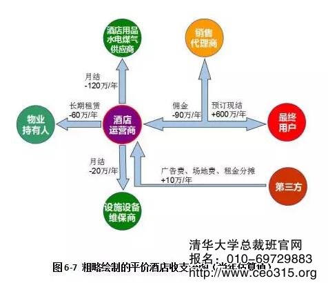 平價酒店最初的盈利模式是“賣服務”,運營成功之后,就應考慮實行連鎖加盟,向“賣投資”、“賣資質”升級。不過,就單店而言,盈利模式也可以進行一定程度的優化,即從第三方賺取收益或向第三方轉嫁成本,如在店內提供廣告位和自動販賣機場地,獲取第三方收入,在店內設立第三方的糕點屋、商品亭,分攤物業租金。然后,在交易結構圖的基礎上,估算出收支狀況或現金流的流入流出情況,繪制出收支流圖或現金流圖,如圖6-7所示。