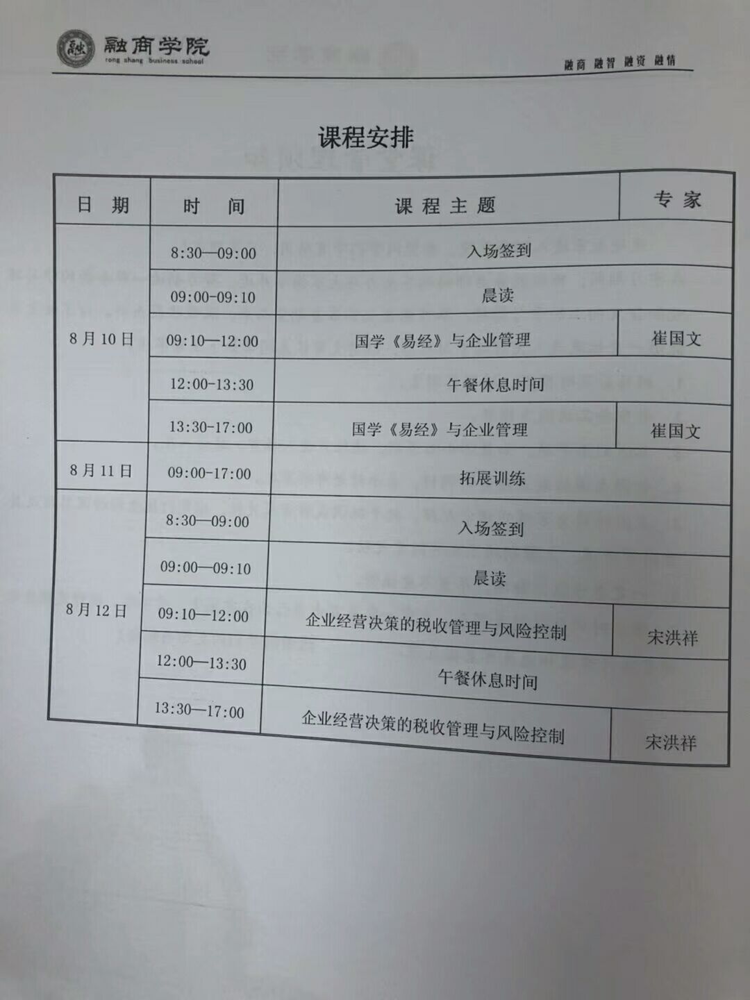 三天的課程馬上就要結束了,從崔國文老師的《國學易經與企業管理》,讓我們知道中國國學的博大精深,再到宋洪祥老師的《企業經營決策的稅收管理與風險控制》讓我們明白了如何在合法的環境下降低稅收負擔,以及一天的課外拓展訓練,更讓我們知道了在一個企業里,團隊的合作精神有多么重要……