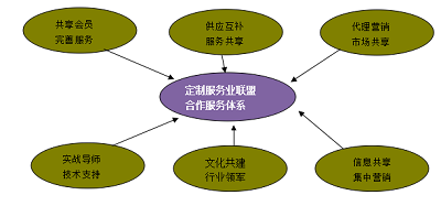 組建中國定制服務業產業聯盟,建設圈層相互代理營銷體系和交易撮合機制,放大學員的影響力優勢,構建信用營銷系統,在專屬的人脈圈層里高效營銷學員的產品與服務。